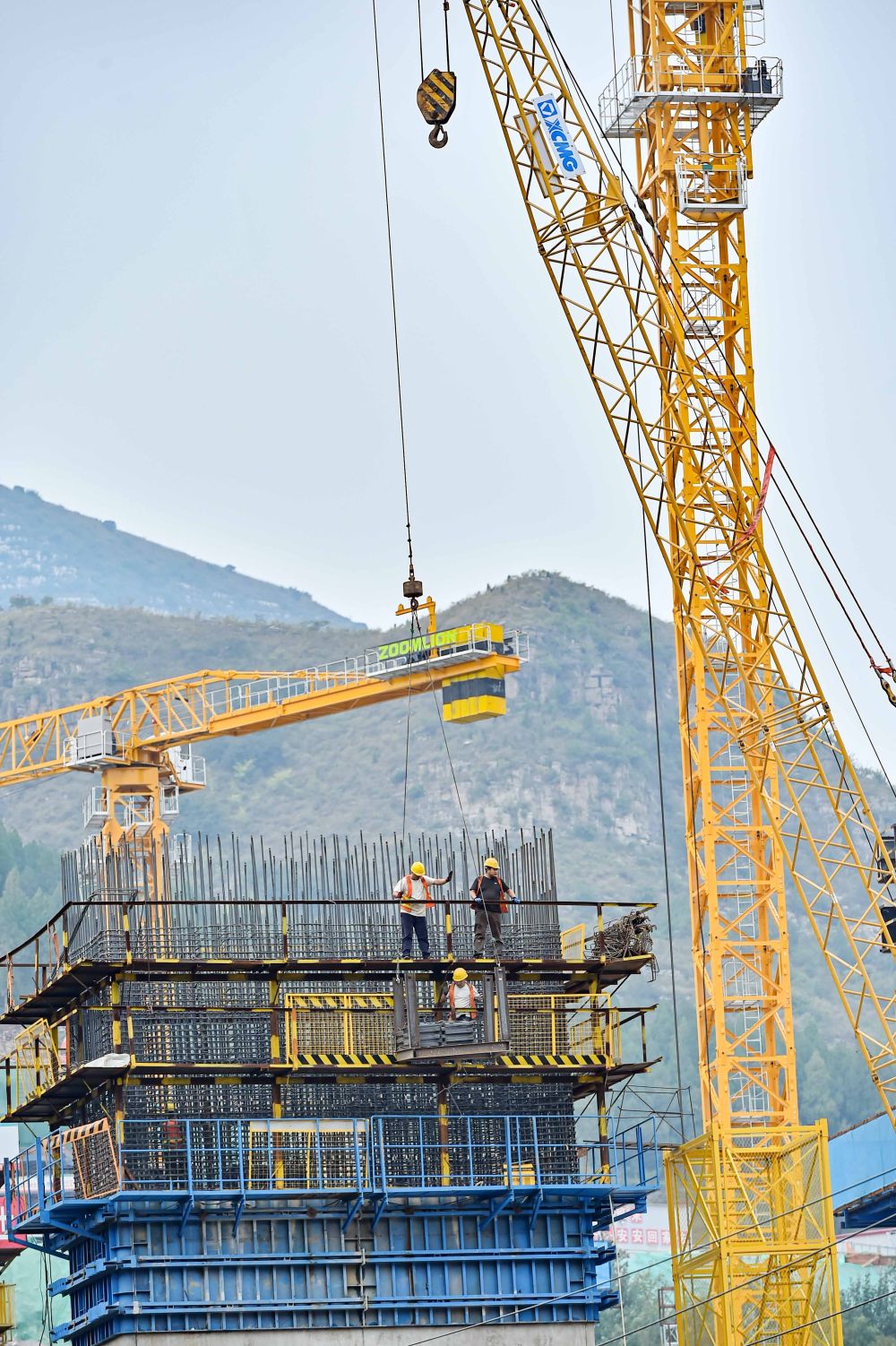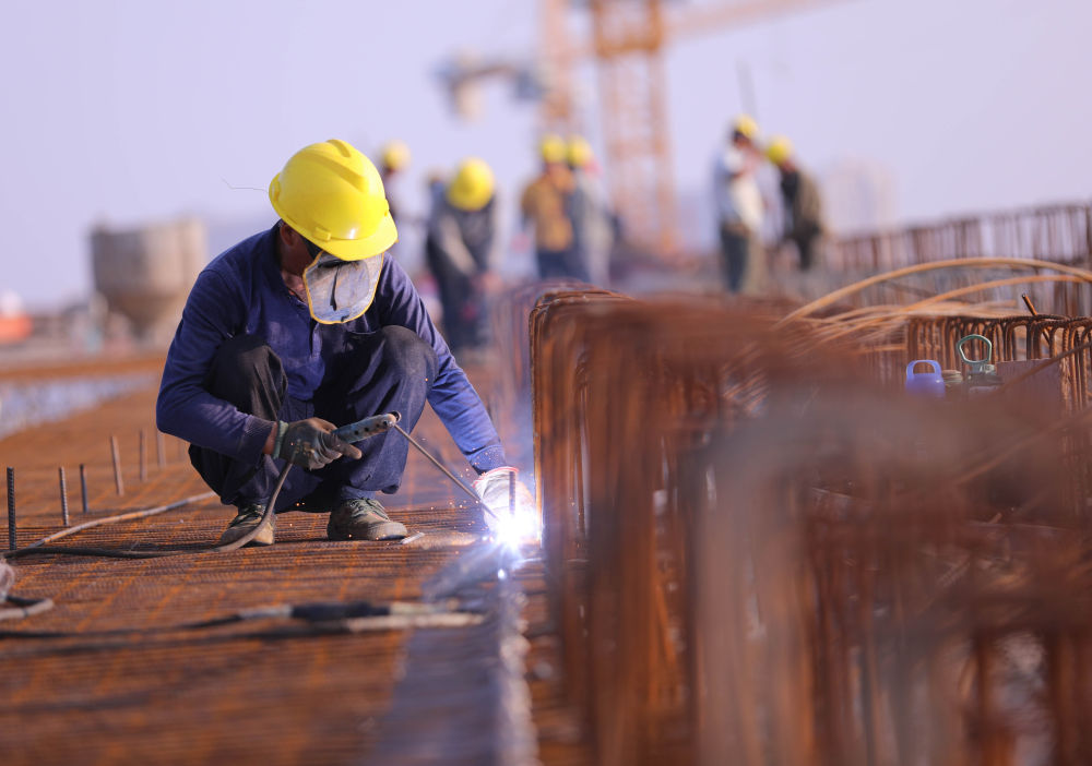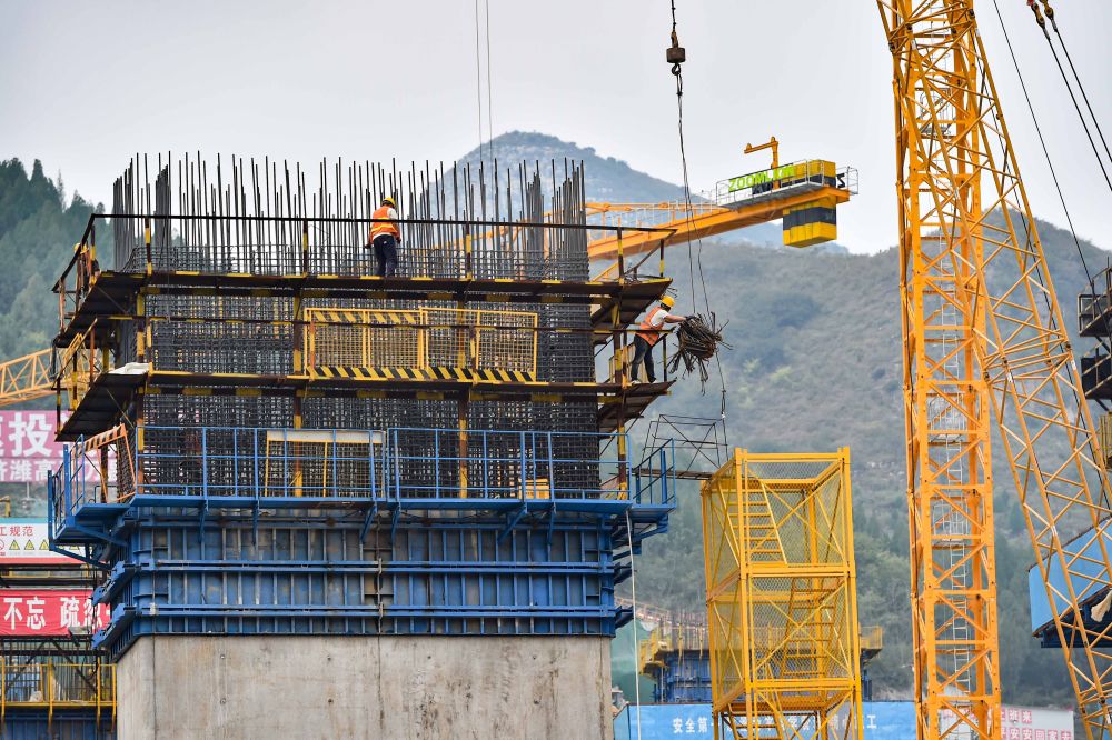 ↑10月3日,建筑工人在山东省济潍高速公路青州段一座大桥建设现场施工。新华社发(王继林 摄)