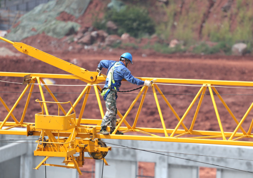 ↑10月2日,建设者在广西南宁市中新南宁国际物流园建设工地检查塔吊。新华社记者 周华 摄