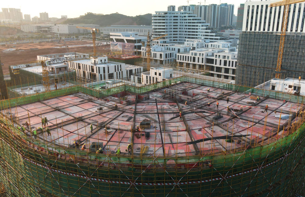 ↑10月2日,建设者在广西南宁市中新南宁国际物流园建设工地忙碌(无人机照片)。新华社记者 周华 摄