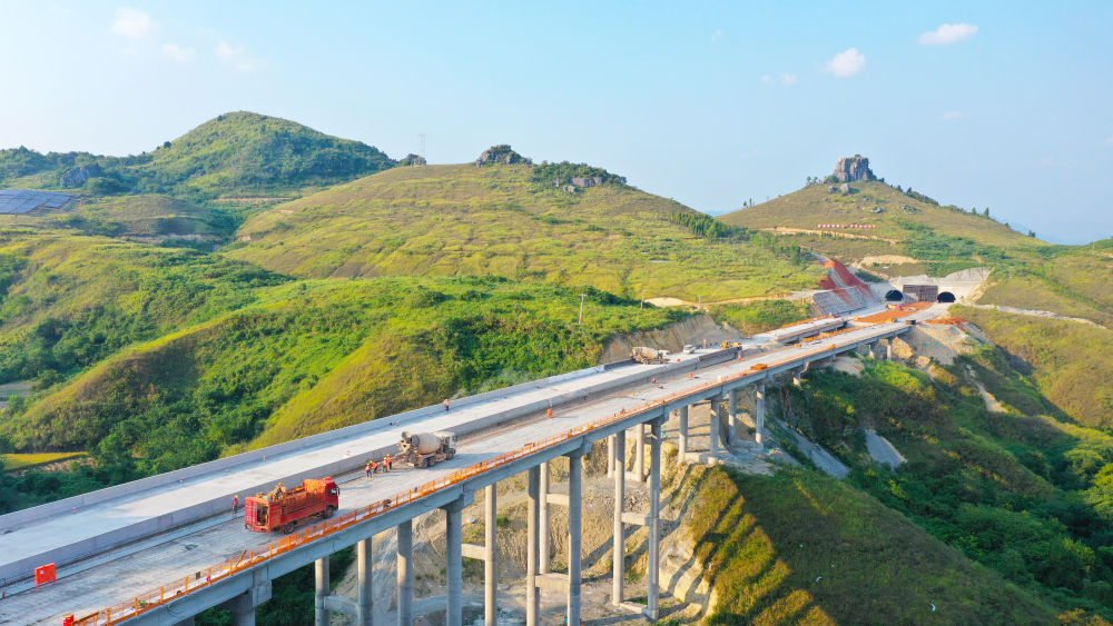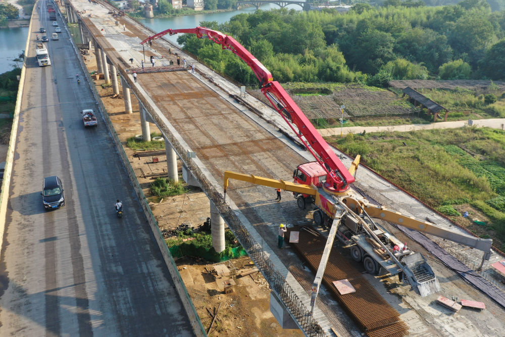 ↑10月3日,建设者在湖南省永州市道县207国道绕城公路拓改工程潇水二桥拓宽大桥项目工地施工。新华社发(何红福 摄)